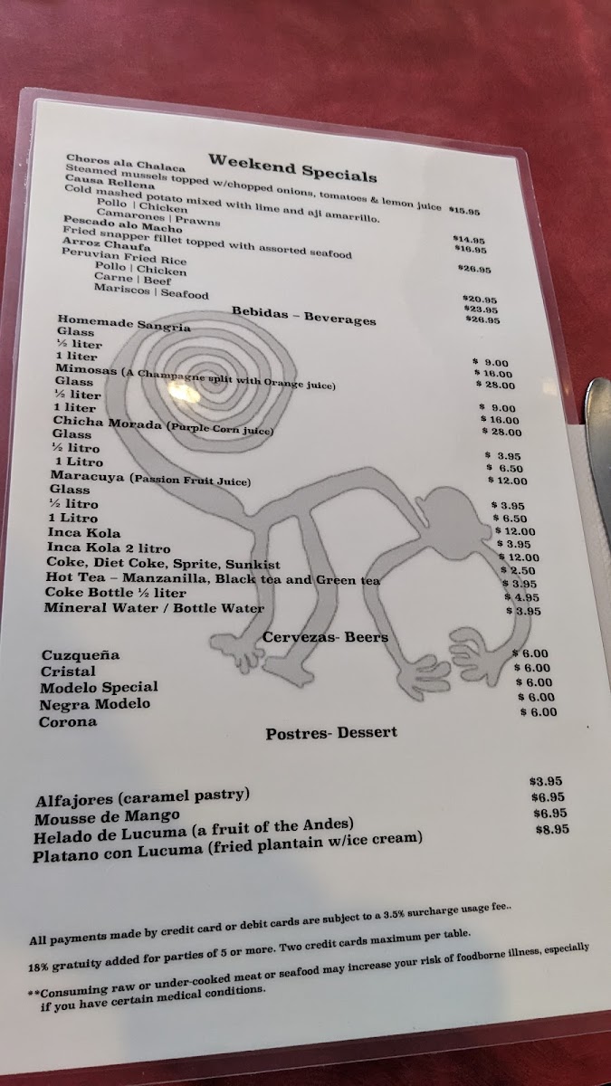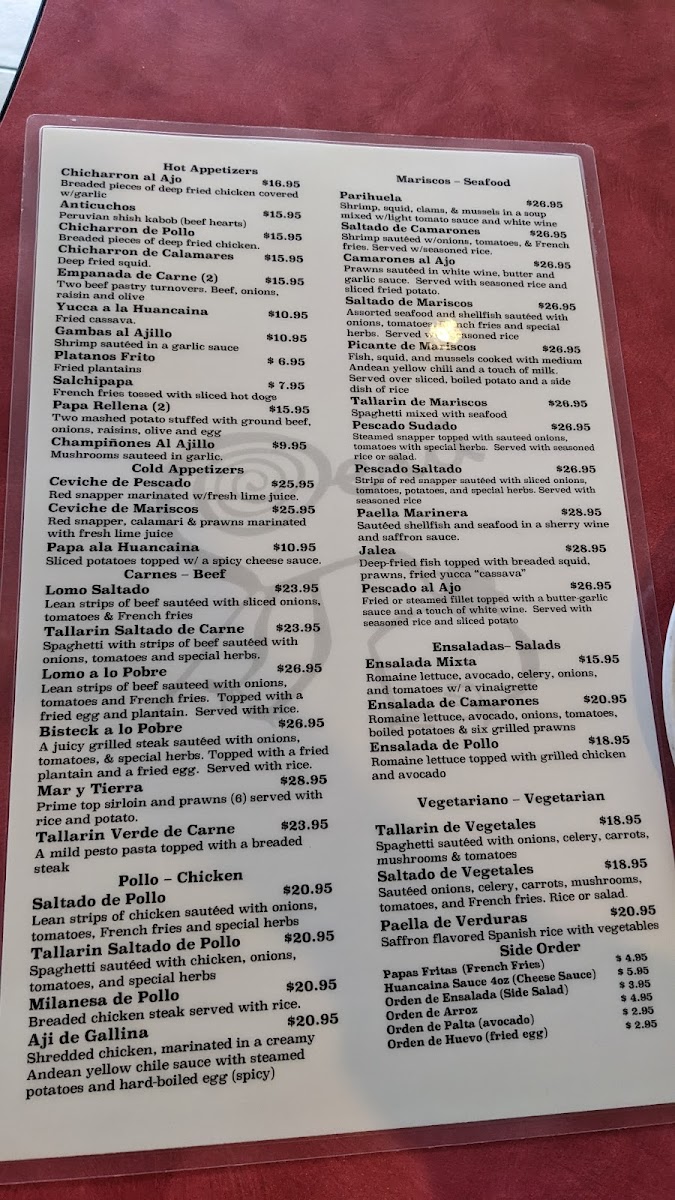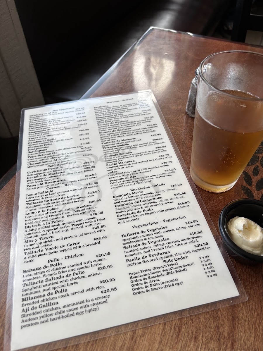 This menu is suitable for casual dining occasions, offering both hearty entrees and beverages that reflect Peruvian culinary traditions. Guests typically use the menu for lunch or dinner, selecting from a variety of seafood and meat dishes complemented by traditional sides and drinks.